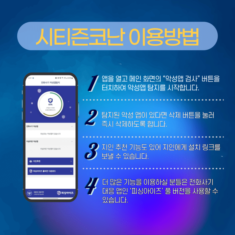 - 악성 앱 실시간 탐지: 보이스피싱에 악용되는 다양한 악성 앱을 실시간으로 탐지하여 사용자에게 경고합니다.