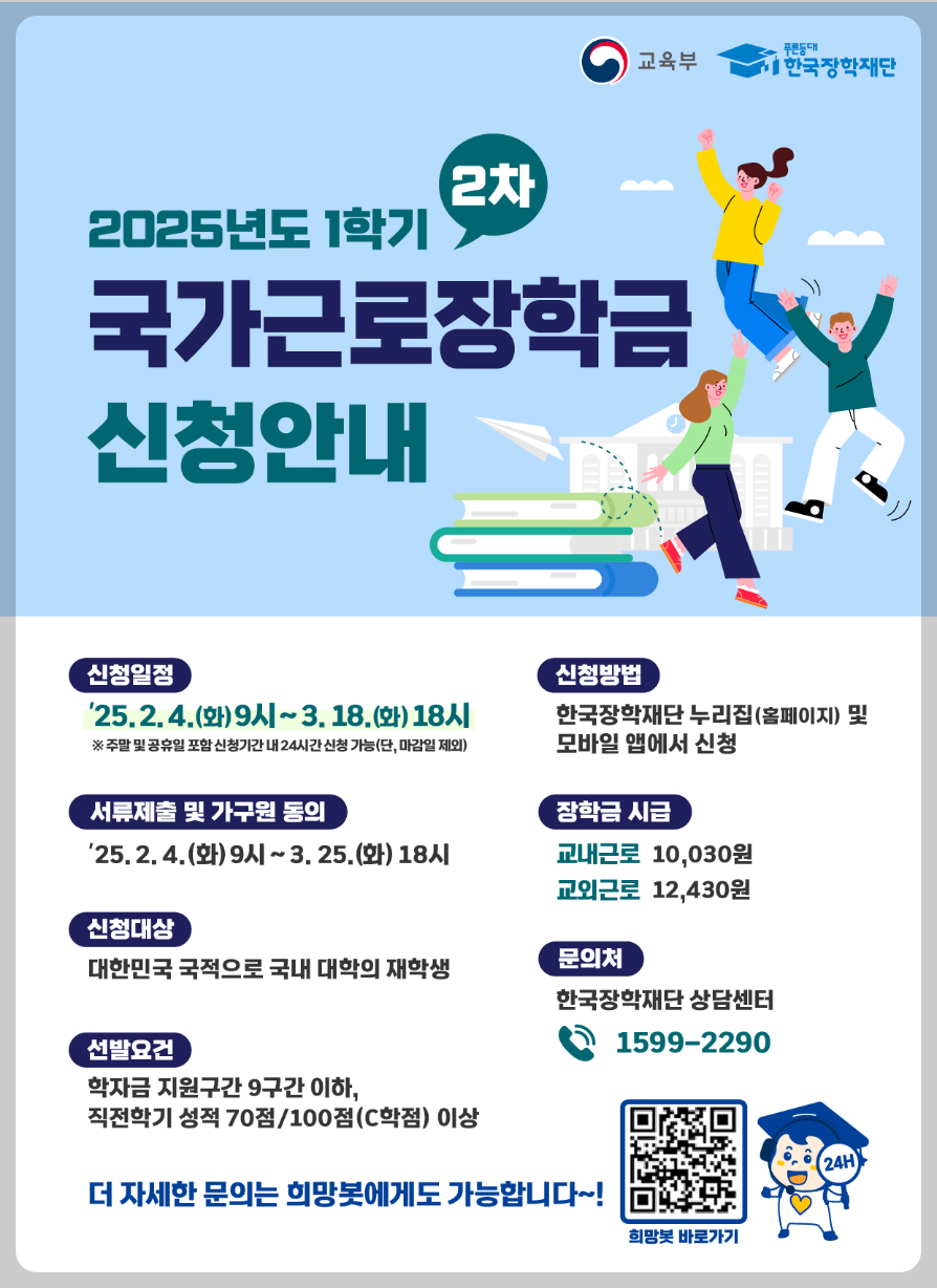 2025년 1학기 국가근로장학금 2차 신청이 2월 4일부터 3월 18일까지 진행됩니다.