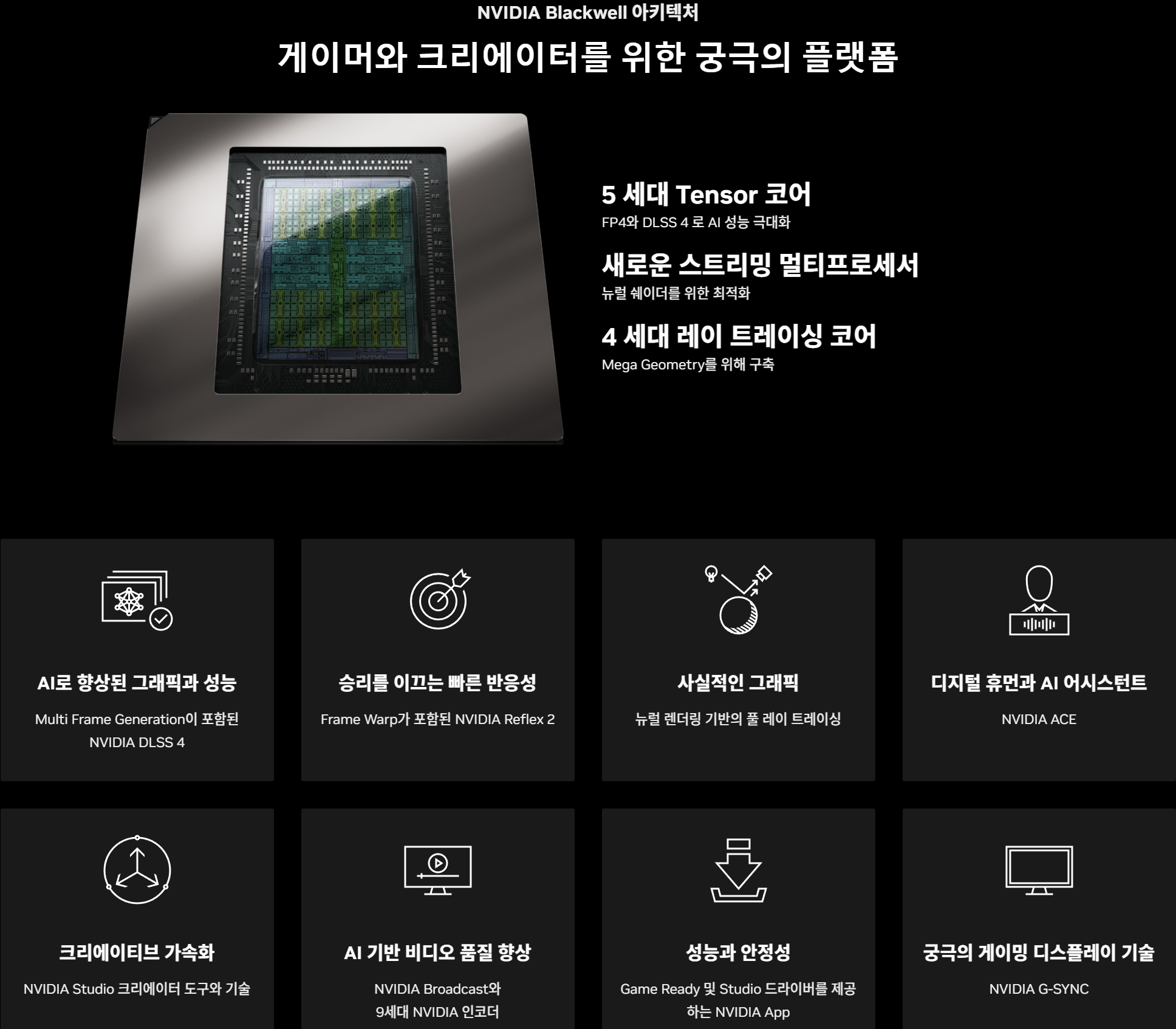 - 아키텍처: RTX 5090은 엔비디아의 최신 Blackwell 아키텍처를 기반으로 설계되었습니다.